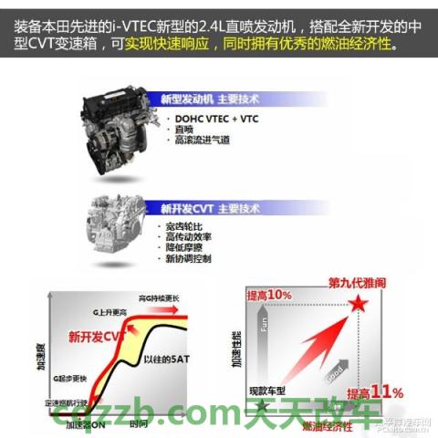 ●地球梦科技也有一款的全新CVT变速器,根据对内部结构组织的优化,进一步降低滚动摩擦力,提升传动效率,在燃油经济性方面有着更加好的主要表现。从图中可以看到,在提速层面,相较于以往5AT,G值飙升的迅速更高一些,并且不断时间更长,代表着加速性能得到提高。相较于现款车,第9代本田雅阁加速性能提高了10%,而燃油经济性也同时提升11%。